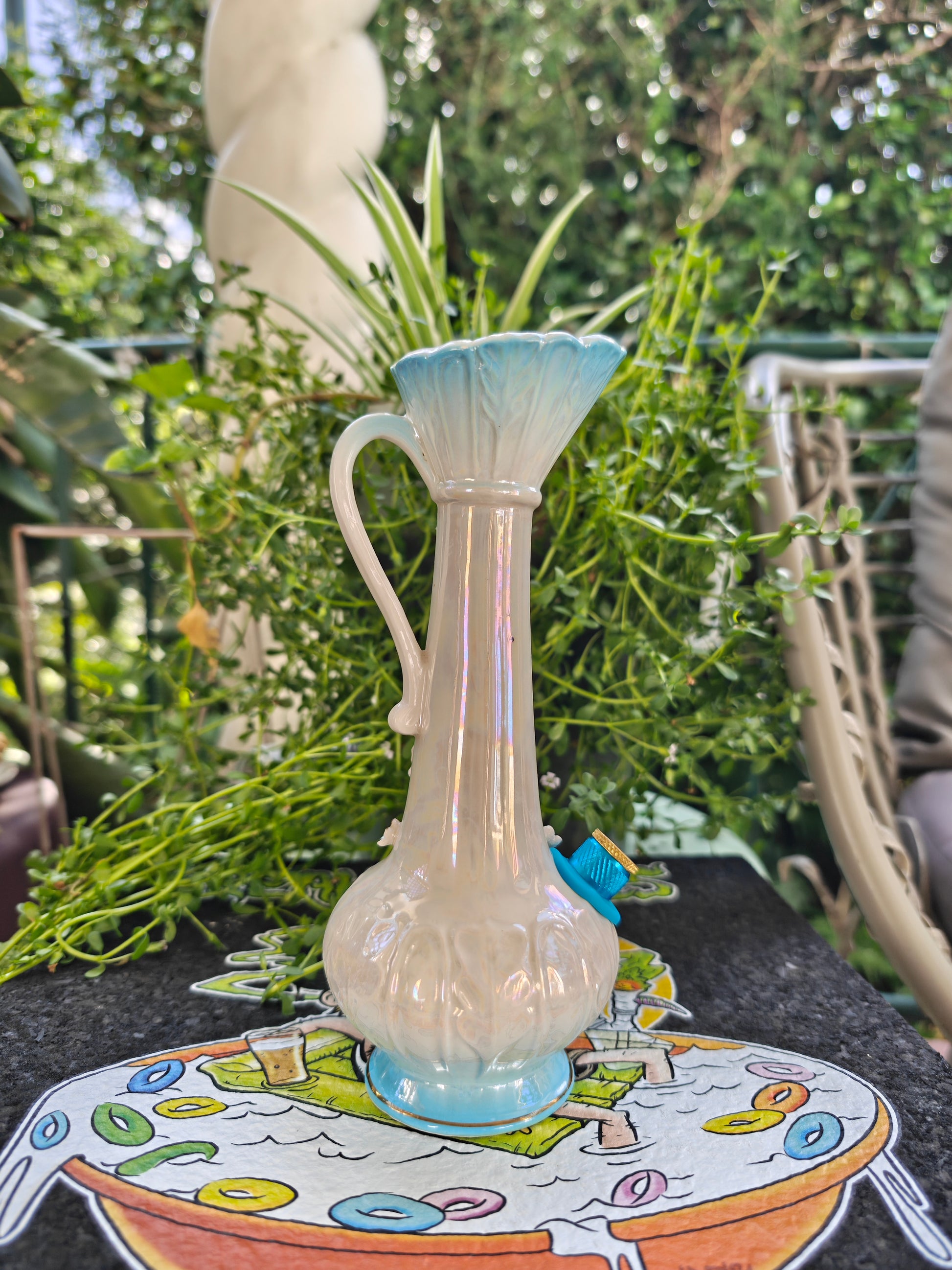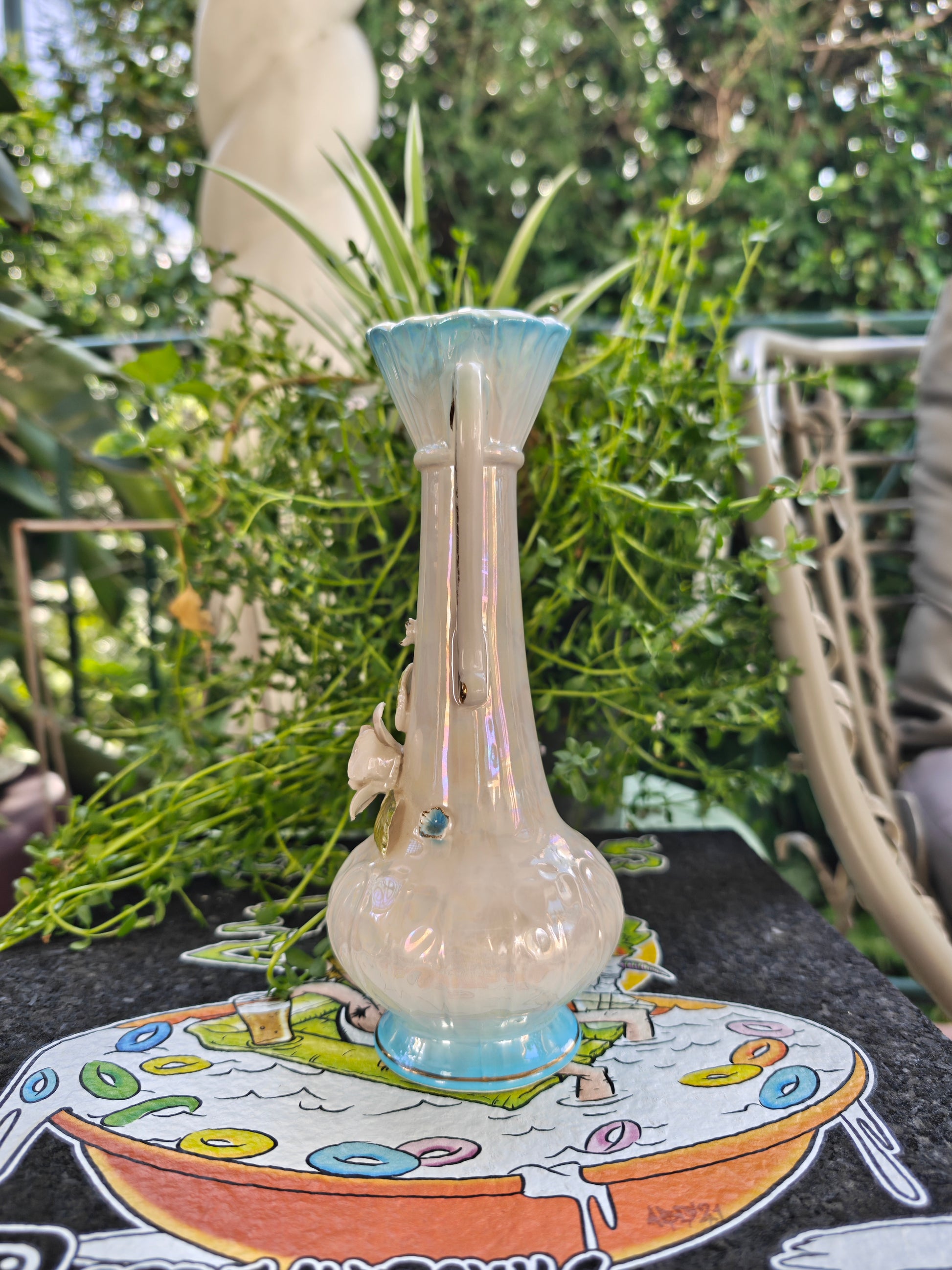 beautiful handled vase with appliqued florals and an iridescent glaze. super ergo rig and works like a true daily
