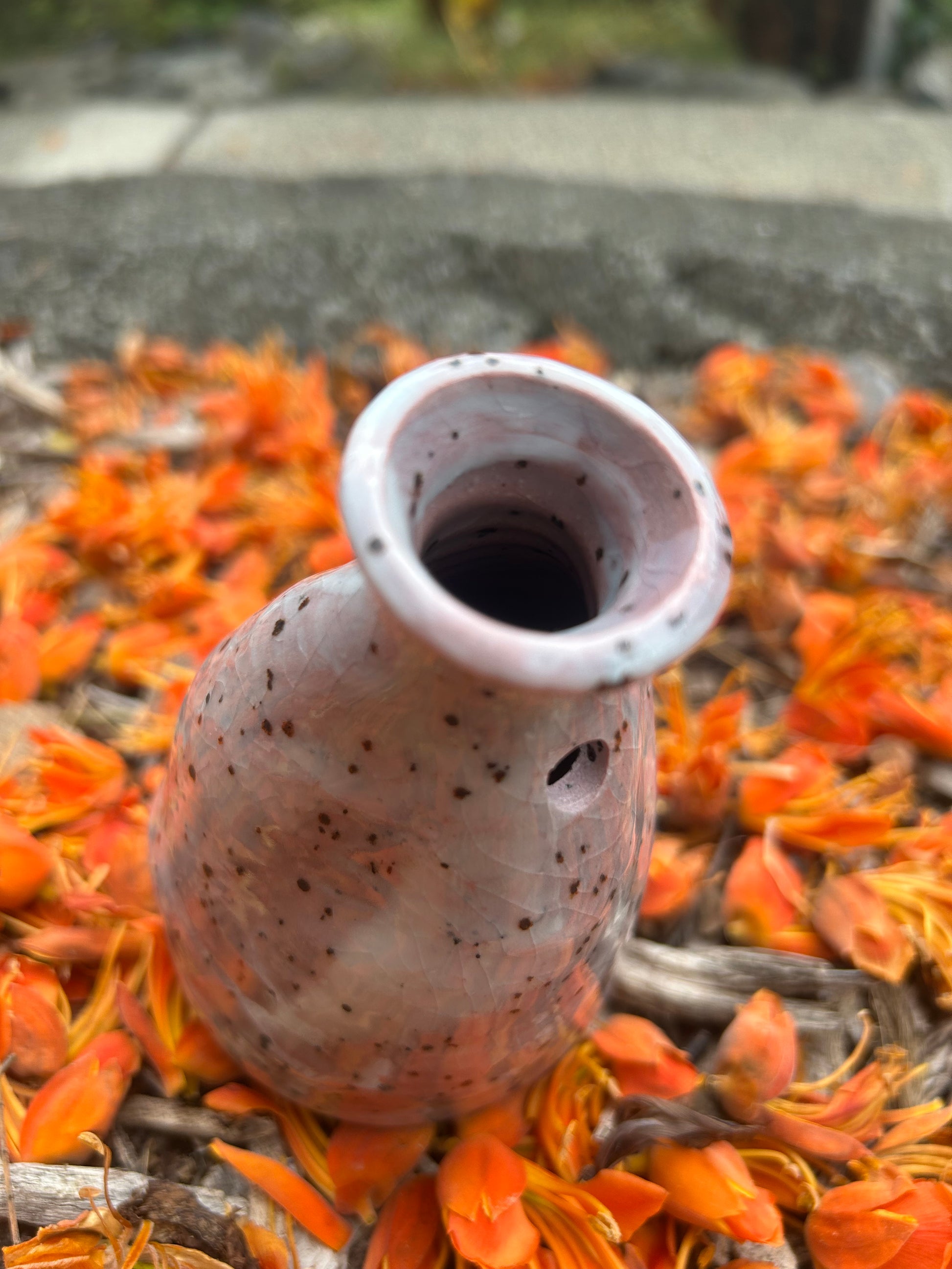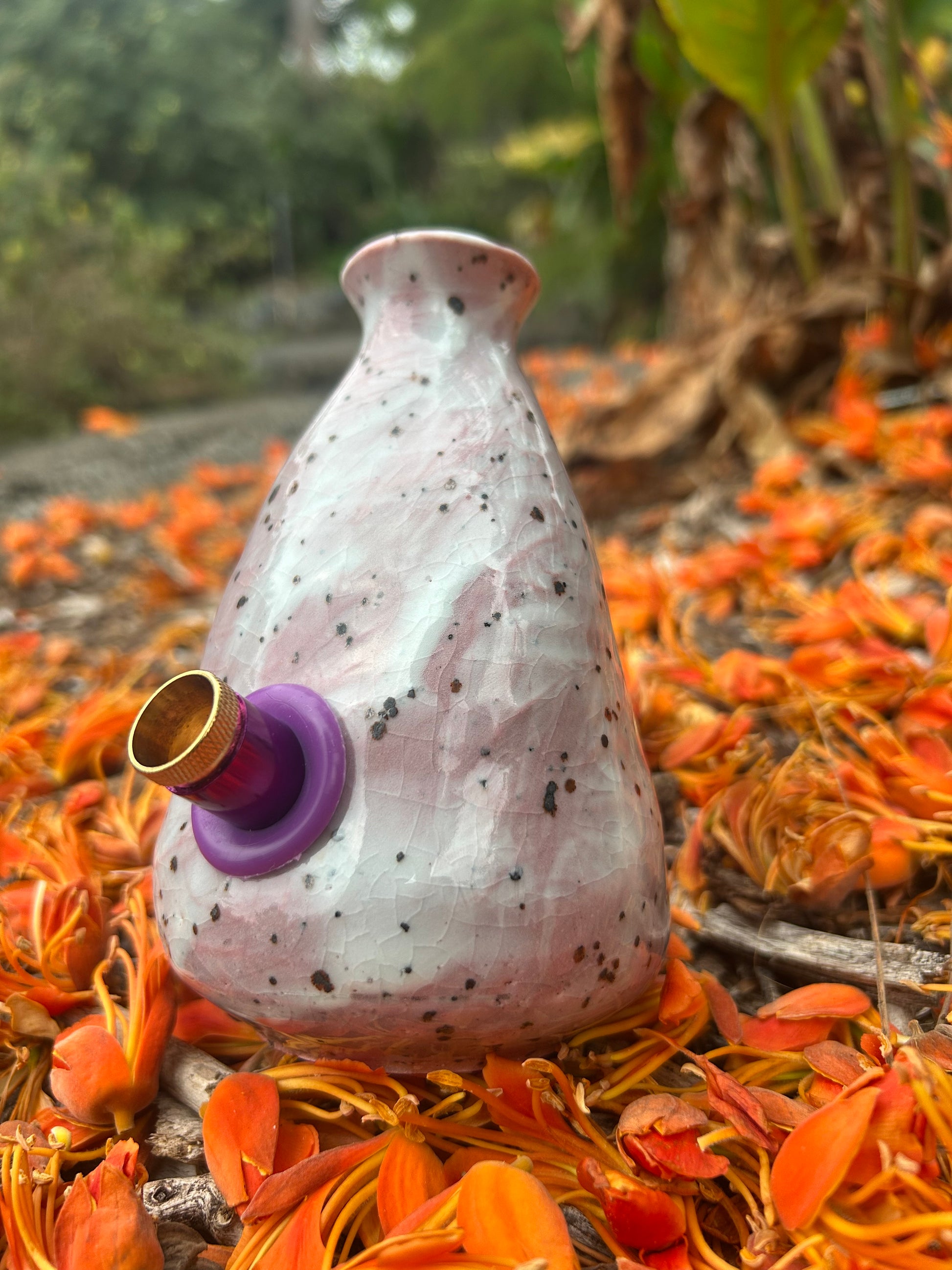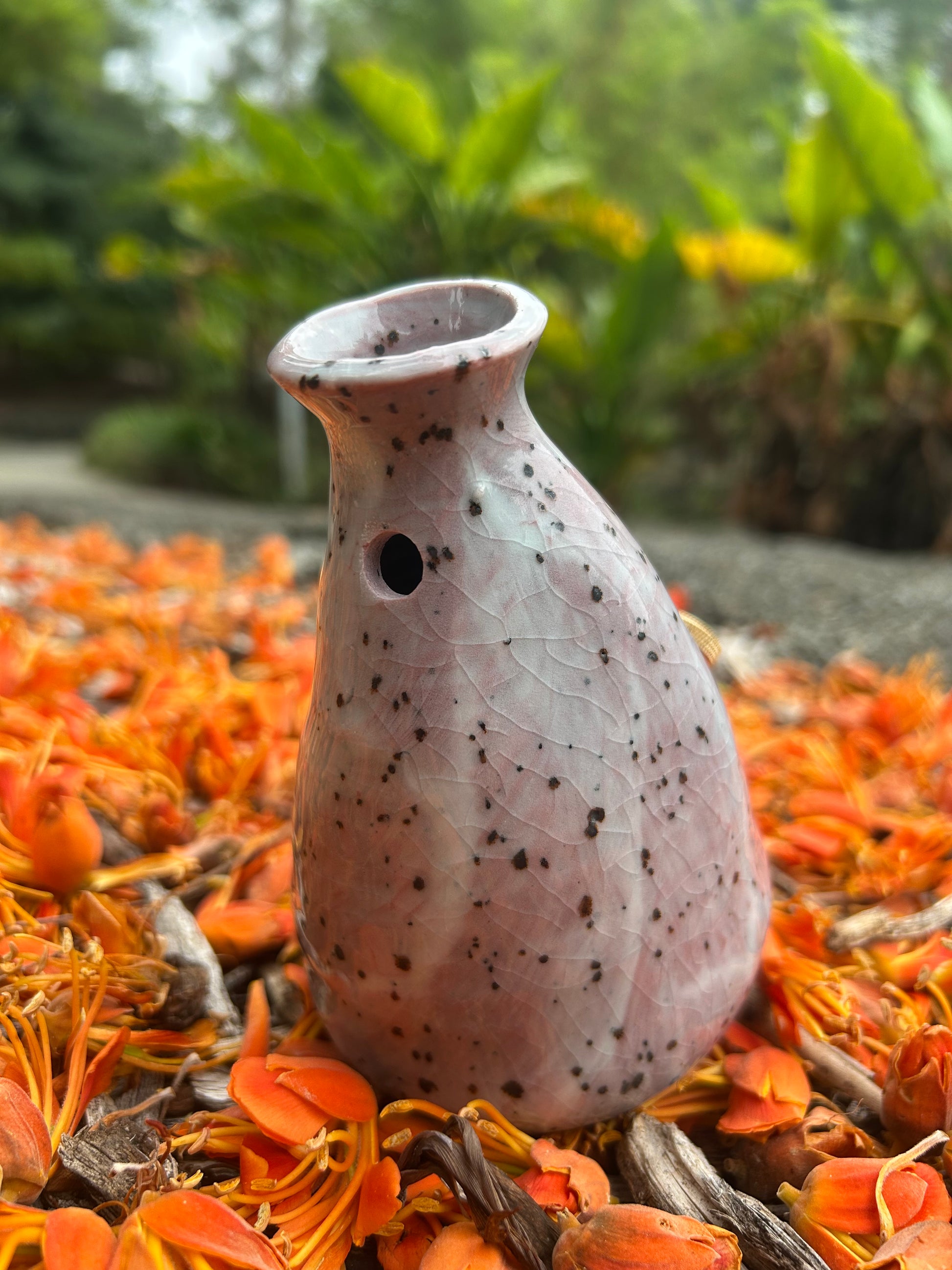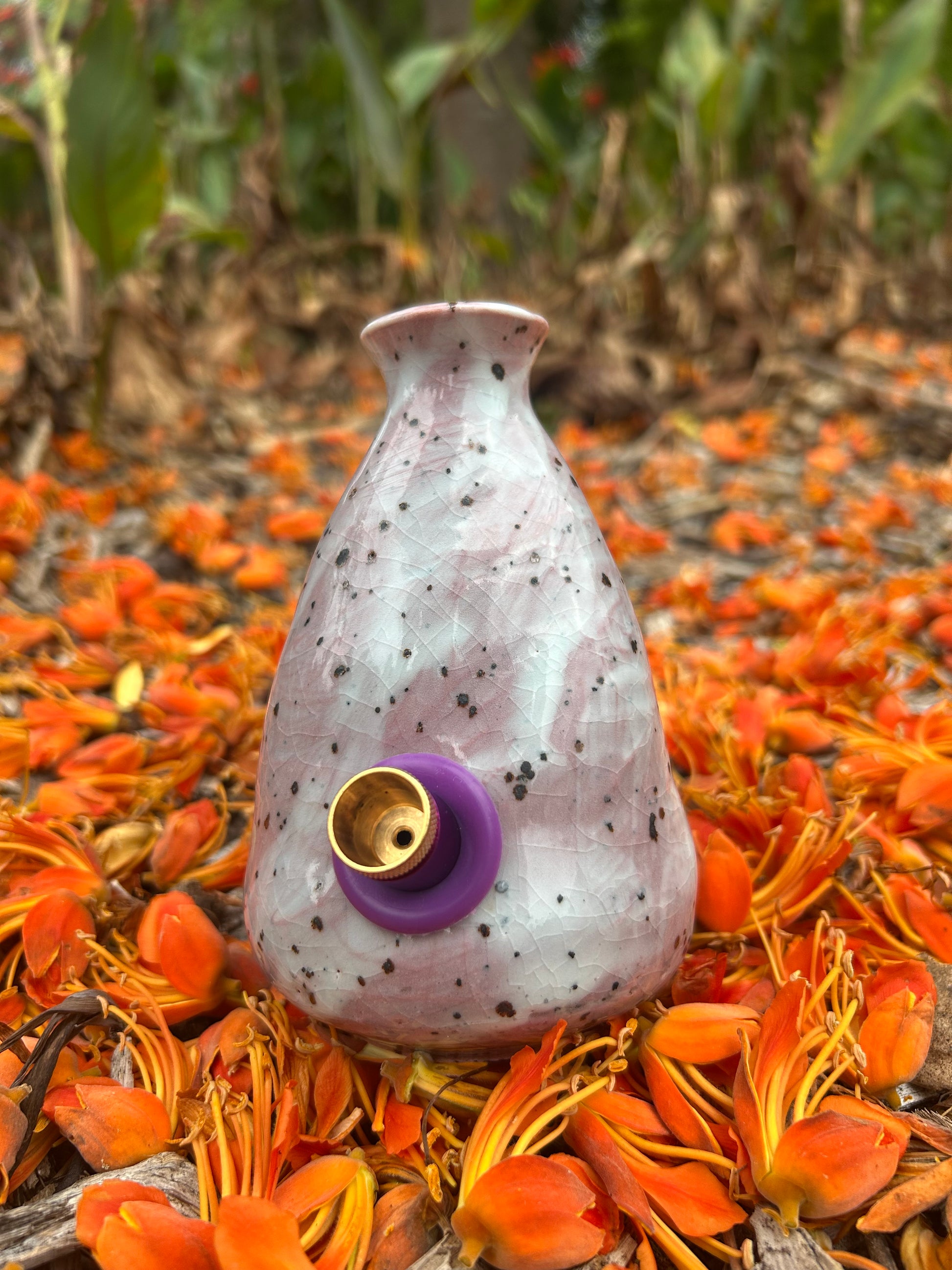 A handmade ceramic vase featuring a pink–purple speckled body finished with a delicate crackle glaze. This piece has been thoughtfully renovated with matching elements, preserving its original character while enhancing its structural integrity. The result is a snug, sculptural form that balances function and artistry.