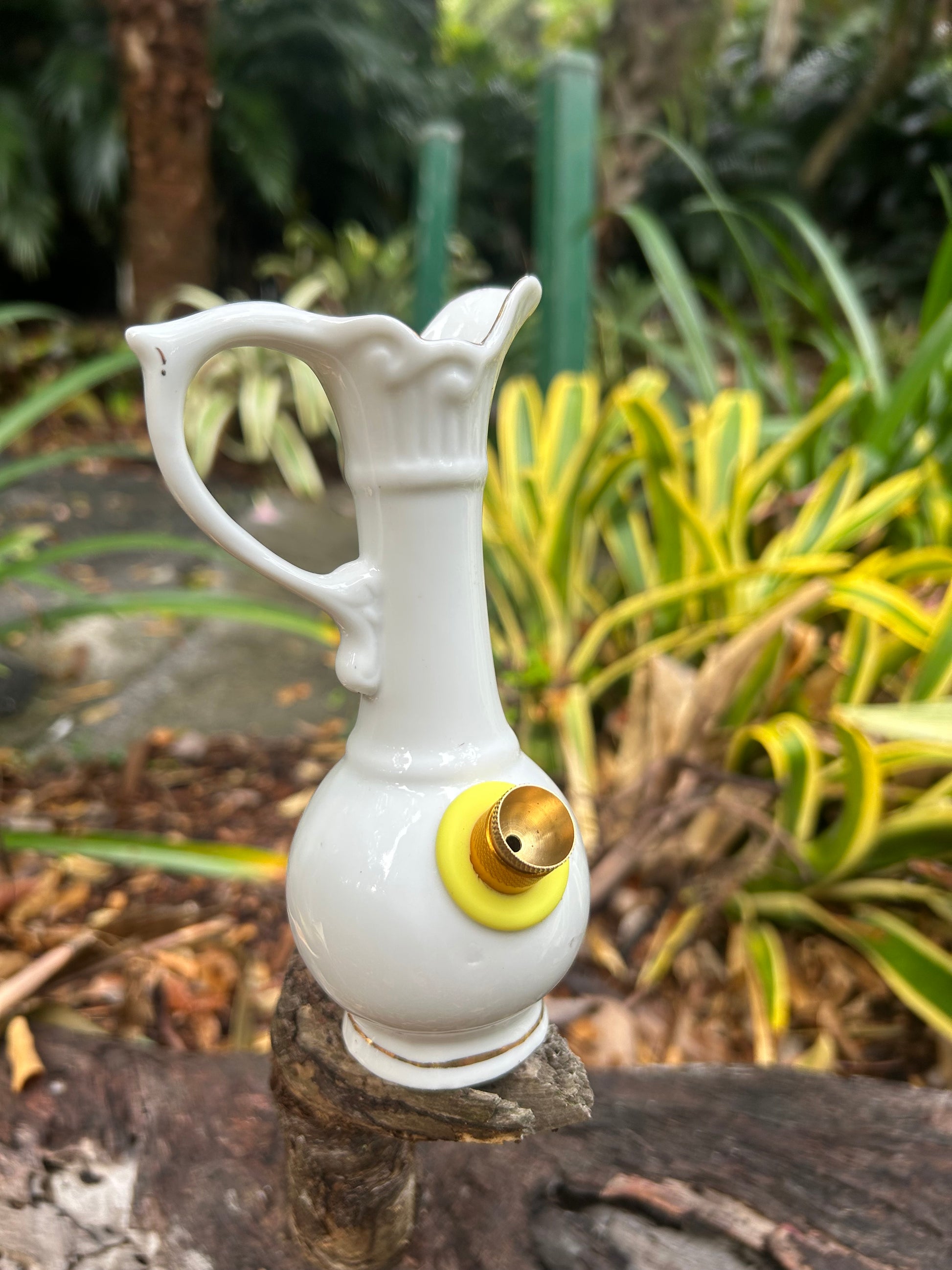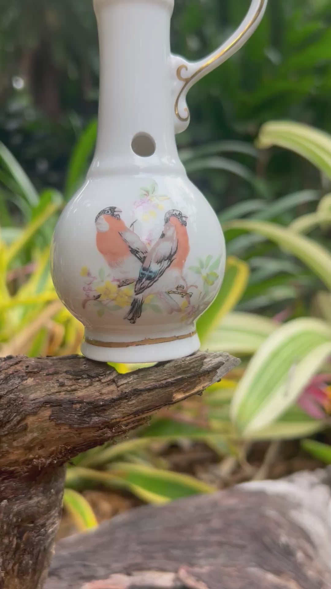 Gracefully transformed from a petite vintage bud vase into a refined smokeable vessel, this piece marries old-world artistry with contemporary ritual. Its porcelain body is adorned with an enchanting oriental bird motif, delicate blossoms, sweeping feathers, and soft gilded accents that catch the light with a quiet shimmer.