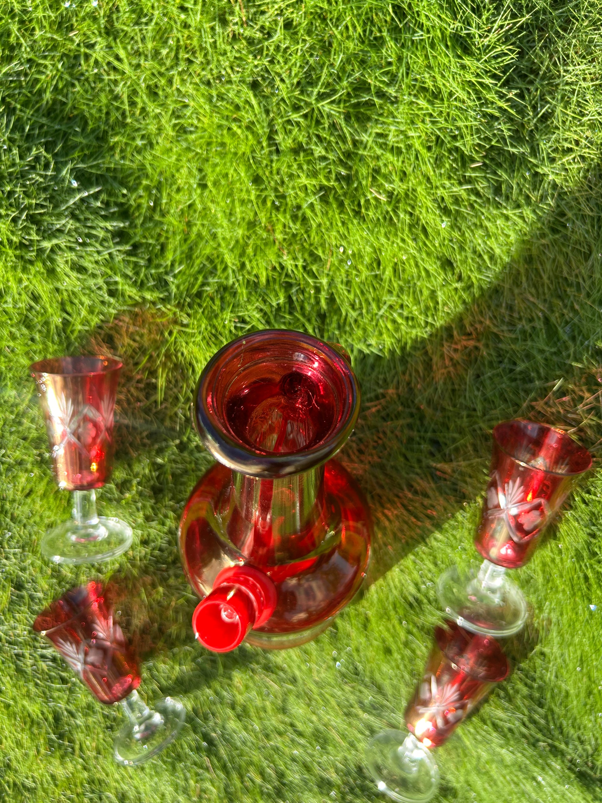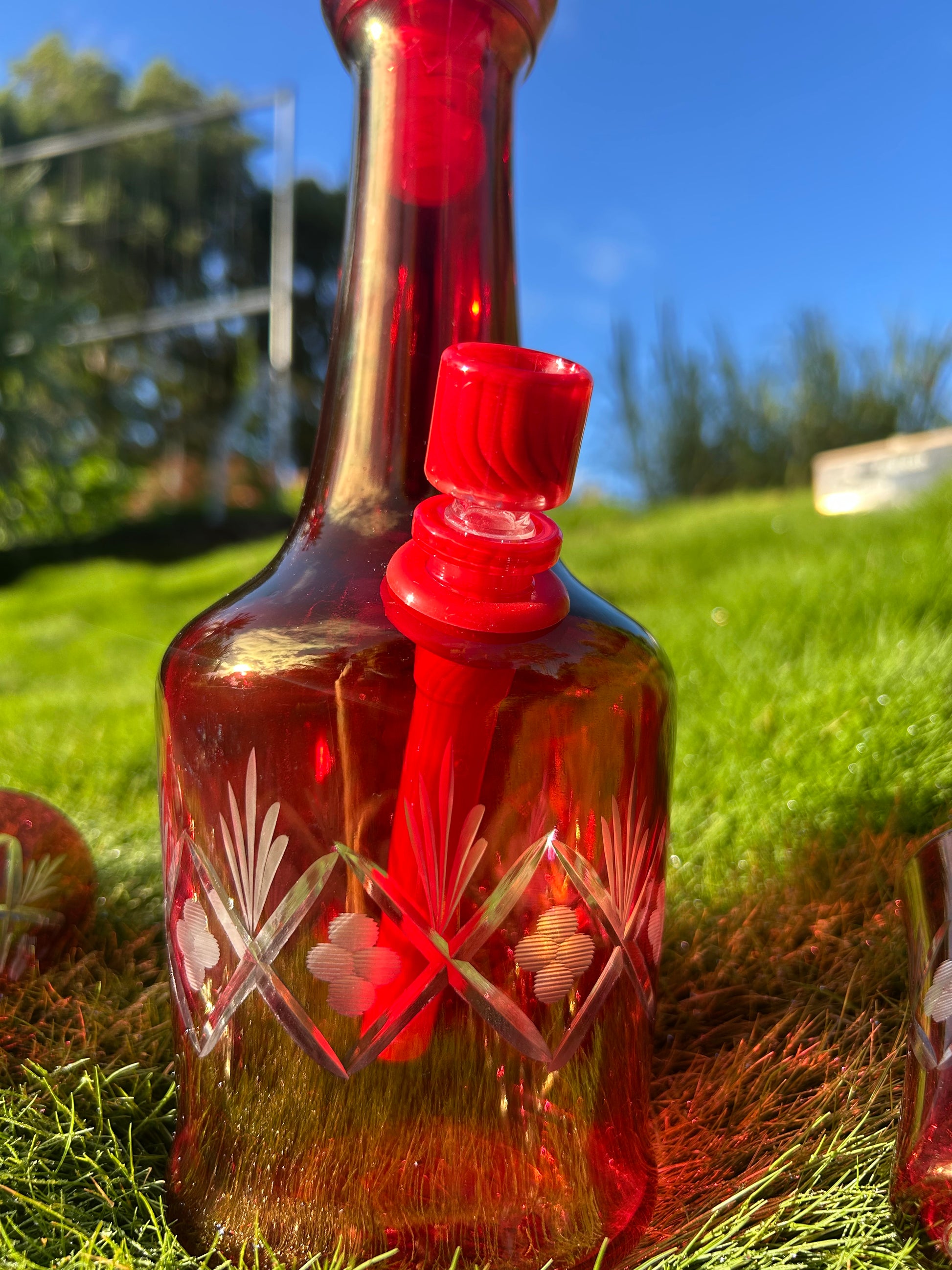 Originally crafted by master Bohemian or French glassmakers in the late 1800s to early 1900s, this decanter was already a high value object. The ruby red overlay, created through the labor intensive casing process and then hand cut back to clear, reveals intricate cross hatching and floral or clover motifs that can only come from skilled hands, not machines. The clarity of the cuts, the depth of the red, and the balance of the form speak to a level of craftsmanship that simply does not exist today.